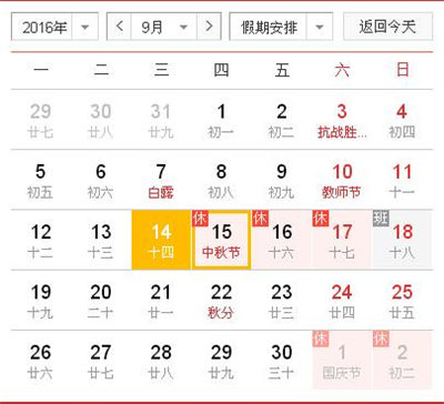 根據(jù)《國務(wù)院辦公廳關(guān)于2016年部分節(jié)假日安排的通知》和省政府辦公廳有關(guān)通知精神,2016年中秋節(jié)放假日期新鄉(xiāng)市天豐振動機(jī)械有限公司具體安排如下:9月15日至17日放假調(diào)休,共3天。9月18日(星期日)上班。